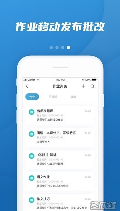 作业包括三个部分:待完成、待批阅、已批阅。可以按学科、年级进行筛选