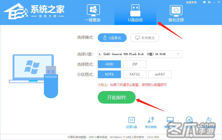 2、选择“U盘启动”点击“开始制作”。